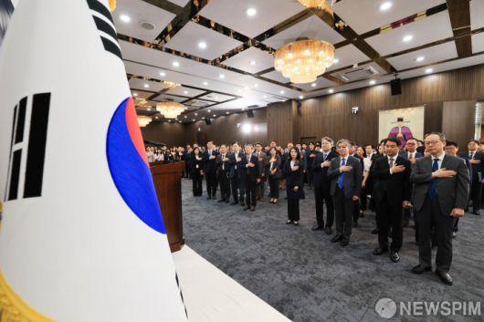 [서울=뉴스핌] 이길동 기자 =김진아 신임 외교부 2차관이 11일 서울 종로구 외교부 청사에서 열린 취임식에서 국민의례를 하고 있다. 2025.06.11 gdlee@newspim.com