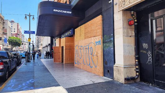 현지시간 10일(현지시간) 미국 캘리포니아 로스앤젤레스(LA)의 보석거리인 6번가에 있는 아디다스 매장. 전날 밤 벌어진 약탈로 상점의 출입문은 뜯겨 있었고, 상점 내부에 있던 물건들은 대부분 도난됐다. 로스앤젤레스=강태화 특파원 |