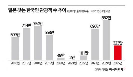 11일 법무부에 따르면 올해 일본에 입국한 한국인 방문객 수는 4월 기준 322만7758명으로 집계됐다. 올해 4월까지 해외로 나간 우리 국민은 총 994만6098명으로 출국자 3명 중 1명은 일본을 목적지로 삼은 것이다. 특히 올해 일본을 찾은 우리 관광객은 지난해 같은 기간(299만9962명)보다 7.6% 증가해 역대 최대 인원을 다시 경신했는데, 이는 전체 해외 관광객 증가율(4.3%)을 상회하는 수치다.