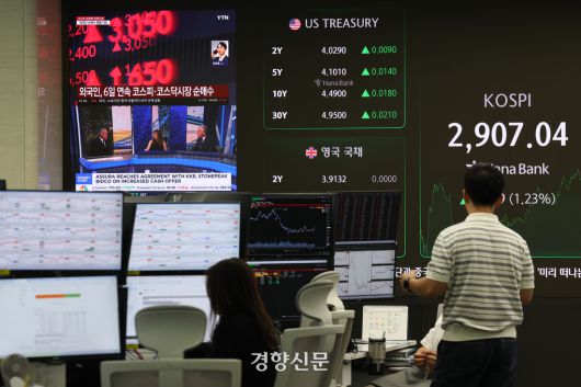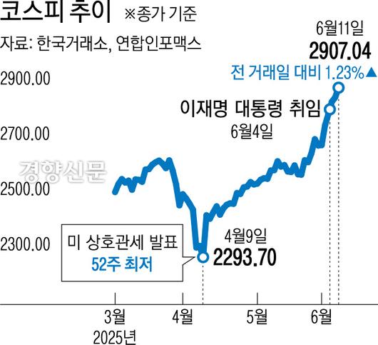 이날 코스피는 전날보다 35.19포인트(1.23%)오른 2907.04에 거래를 마감하며 지난해 7월 11일 기록한 52주 신고가(2896.43)를 경신했다. 코스피 종가가 2900선을 넘긴 것은 문재인 정부 당시인 2022년 1월14일(2921.92) 이후 약 3년 반만이다.