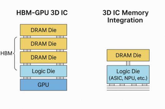 그렇다면 이 구조가 HBM-GPU 구성의 3D IC 구성과 다른 점이 무엇인지 알아볼까요. HBM-GPU 기반 3D IC는 메모리 역할을 하는 D램 다이와 이를 제어하는 베이스 다이로 결합된 패키지인 HBM을 GPU 위에 직접 붙이는 방식입니다.