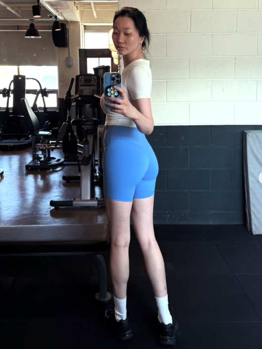 이어진 헬스장 거울 셀카에서는 블루 컬러의 팬츠를 착용한 채 뒷모습을 당당히 드러내 눈길을 끌었다. 꾸준한 운동으로 완성된 힙라인이 돋보이는 컷이다.