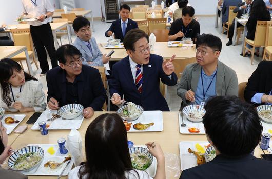 기자단과 점심 식사 이재명 대통령이 11일 서울 용산 대통령실 구내 기자식당에서 기자단과 점심 식사를 함께하며 대화를 나누고 있다. 메뉴는 쌀국수와 구운 닭다리였다. 대통령실사진기자단 |
