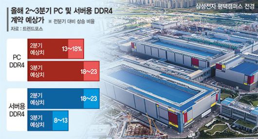 11일 시장조사업체 트렌드포스 및 업계에 따르면 올해 2·4분기 DDR4 계약 가격은 전분기 대비 PC용이 13~18%, 서버용은 18~23% 가량 상승할 것으로 예상된다. 이는 당초 전망치(각각 PC용 3~8%, 서버용 5~10%)를 두 배 이상 상회하는 수치다.