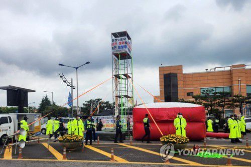 7m 망루 설치해 고공농성 나선 금속노련 |