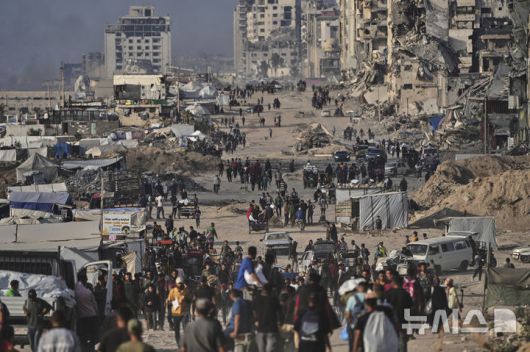 [가자시티=AP/뉴시스] 9일(현지 시간) 가자지구 북부도시 가자시티에서 팔레스타인 난민들이 파괴된 건물 잔해가 즐비한 해안가를 따라 이동하고 있다. 2025.06.10. |
