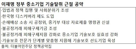 이 대통령은 이외에도 불공정거래행위 등으로 손해를 입은 피해자와 피해 기업의 법률 자문, 소송 지원, 경영안정자금 등으로 활용 가능한 불공정거래 피해구제기금 조성, 중소기업의 기술보호 실효성 강화, 기술보호 선도기업 육성 등을 공약으로 제시했다.