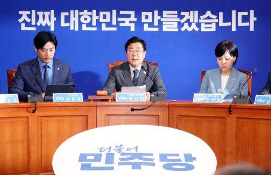 박찬대 더불어민주당 대표 직무대행 겸 원내대표(가운데)가 11일 국회에서 열린 당 최고위원회의에서 발언하고 있다. 김경호 선임기자 jijae@hani.co.kr |
