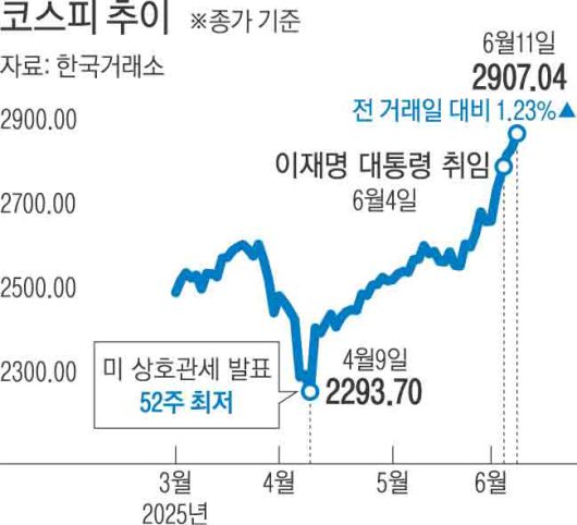 이날 코스피지수는 이달 들어 6거래일 연속 상승해 2907.04로 마감했다. 2022년 1월14일 이후 3년5개월 만에 가장 높은 수준이다.