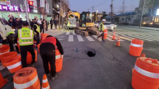 11일 오후 5시 45분쯤 서울 강남구 대치동 강남경찰서 사거리 인근 차도에서 지름 약 30㎝ 규모의 땅꺼짐(싱크홀) 현상이 발생해 도로 일부가 통제됐다.