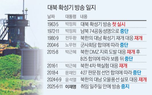 합동참모본부는 이날 오후 이재명 대통령의 지시에 따라 접경지역 모든 전선에서 대북 확성기 방송을 중지했다. 이 대통령은 대선 후보 시절부터 대북·대남 확성기 방송 중지 등을 통해 남북관계 개선의 실마리를 찾겠다고 공약했다. 이 대통령은 지난 4일 취임사 격인 ‘국민께 드리는 말씀’에서도 “평화가 경제”라며 “아무리 비싼 평화도 전쟁보다 낫다”고 밝혔다.