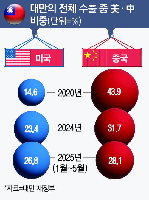 9일 대만 재정부에 따르면 대만의 올해 1~5월 수출액은 전년 동기 대비 24.3% 늘어난 2299억 달러(약 315조원)를 기록했다. 이중 대 중국 수출액(홍콩 포함)은 646억 달러(88조원)로 전년 동기 대비 12% 가량 늘었지만, 전체에서 차지하는 비중은 28.1%에 그쳤다. 1~5월 기준 대만의 대 중국 수출 비중이 30%에 미치지 못한 것은 지난 2001년 이후 처음이다.