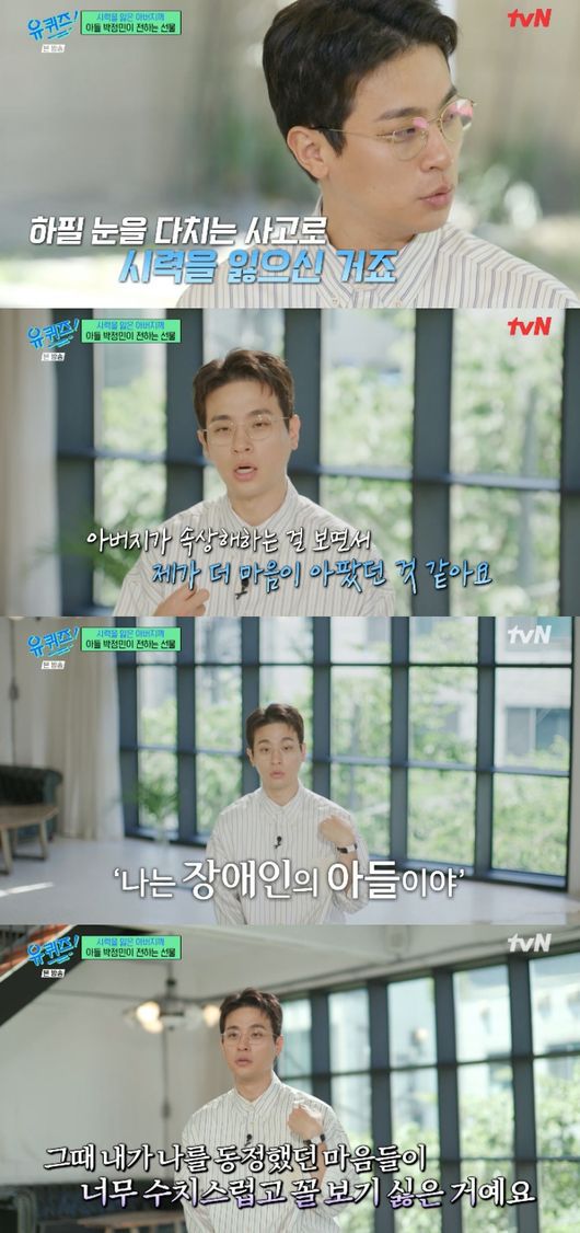 이어 “눈에 장애가 있으셨음에도 불구하고 60년 살아오셨는데 시력을 완전히 잃은 뒤 생각해보니 우리 아버지가 눈이 잘 안 보인다는 사실에 저 자신을 동정해 온 것 같은 느낌을 받았다. 나는 ‘장애인의 아들이야’ 못된 동정이 생겼다. 그때 내가 나를 동정했던 마음들이 너무 수치스럽고 꼴보기 싫었다”라고 털어놨다.