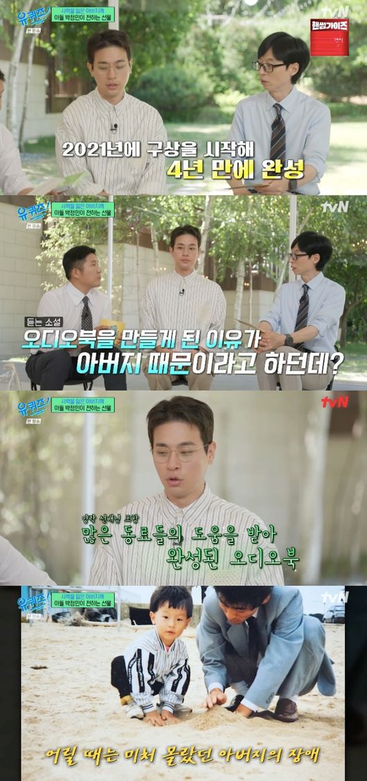 유재석은 “오디오북을 만든 가장 큰 이유는 아버지 때문이라고?”라고 물었다. 박정민은 “아버지가 원래 눈에 장애가 있으셨다. 어려서부터 있었다. 그래서 저희 집은 원옛날부터 바닥에 뭘 놔두면 안됐다. 저희 아버지 뿐만 아니라 눈이 불편하신 분들께 먼저 책을 드리고 싶었다”라고 답했다.