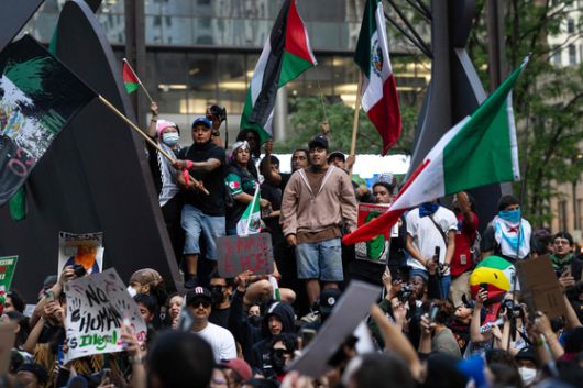 불법 이민자 단속에 반대하는 시위가 미국 전역으로 확산한 가운데 10일(현지시간) 시카고에서 시위대가 피카소 조형물 위에 올라가 멕시코 국기 등을 흔들고 있다. [AFP=연합뉴스] |