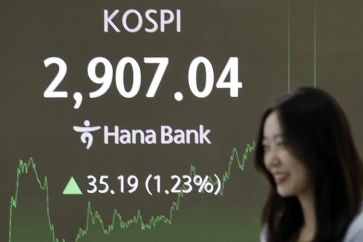이재명 대통령이 한국거래소를 방문한 11일 코스피가 2907.04를 기록했다. 사진은 이날 하나은행 딜링룸의 주가 현황판. [뉴시스] |