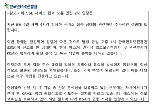 2차 입장문에는 "이번 장애는 랜섬웨어 감염에 따른 것으로 발생 당일 오후 1시 KISA에 신고를 한 상태이며, 현재 예스24 권민석 최고보안책임자 및 관련부서가 KISA와 협력해 원인 분석 및 복구 작업에 총력을 다하고 있다"는 내용이 담겼다.