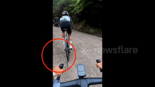 자전거 경주에 참여 중이던 한 남성은 자전거로 물체가 날아와 당황하는 듯 했다. 뱀이었다.