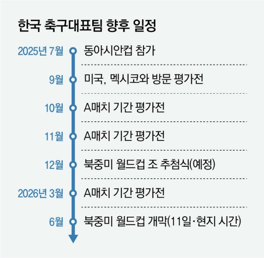 대표팀은 7월 K리거 위주로 팀을 꾸려 국내에서 열리는 동아시아축구연맹(EAFF) E-1 챔피언십(동아시안컵)에 참가한다. 9월엔 북중미 월드컵 개최 국가 중 하나인 미국에서 미국, 멕시코와 차례로 평가전을 치른다. 월드컵 본선 조 추첨식은 12월에 열릴 예정이다. 홍 감독은 동아시안컵을 시작으로 월드컵 최종 엔트리 선정을 위한 ‘옥석 가리기’에 돌입한다. 홍 감독은 “우리 팀의 베스트 멤버는 아직 정해지지 않았다”면서 “중요한 것은 (월드컵 본선이 열리는) 내년 6월에 누가 정말 좋은 경기력을 유지하고 있느냐다”라고 말했다.