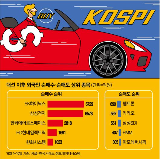 이 같은 상승세는 외국인 투자자가 국내 증시에서 대거 사들였기 때문인 것으로 파악됐다. 한국거래소 정보데이터시스템에 따르면 대선 이후 외국인은 코스피를 4일 1조972억원, 5일 9748억원, 9일 1조307억원, 10일 8995억원 등 하루 평균 1조원가량 순매수했다.