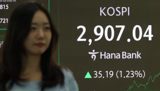 11일 서울 중구 하나은행 본점 딜링룸 현황판에 코스피가 표시돼 있다. 이날 코스피는 전장보다 35.197p 오른 2,907.04로 마감해 3년 5개월만에 2,900선을 돌파했다. [이승환 기자] |