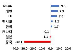 같은 기간 미국 ATP 수입 시장에서 아세안(+9.5%p), 대만(+7.9%p), 유럽연합(EU)(+7.0%p) 등은 비중을 확대하며 중국의 빈자리를 빠르게 대체했다.