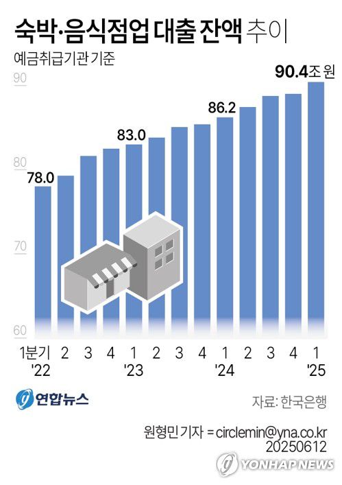 숙박·음식점업 대출 잔액이 90조원을 넘어선 것은 이번이 처음으로, 전 분기(89조190억원)보다 1조4천79억원 증가했다.