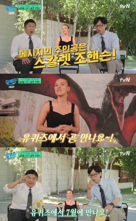 영상 속에서 스칼렛 조핸슨은 "제가 드디어 한국에 가게 됐다. 영화 '쥬라기 월드: 새로운 시작'과 함께"라며 "7월에 만나러 가겠다. 자기님들 빨리 만나고 싶다. '유퀴즈'에서 곧 만나요"라고 인사했다.