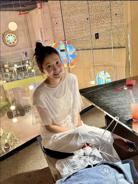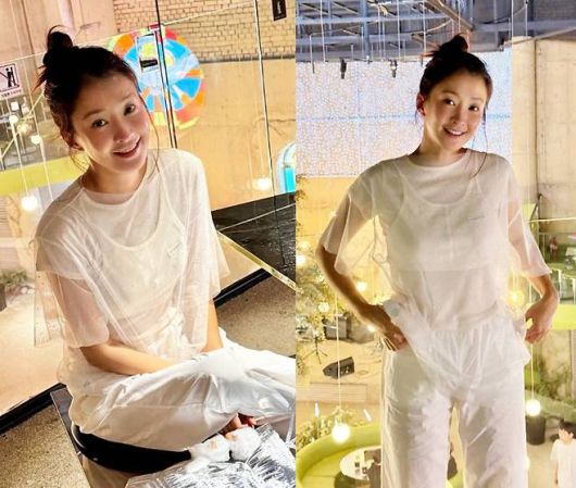 살짝 비치는 펄 시스루 톱은 은은한 광택감으로 조명을 받으며 유리처럼 반짝였고, 안에 레이어드된 슬리브리스 탑이 청순한 매력을 더했다. 여기에 매끈하게 떨어지는 화이트 팬츠를 매치해 바디라인을 자연스럽게 살렸으며, 깔끔하게 올려 묶은 헤어스타일은 얼굴선을 강조해 시선을 집중시켰다.