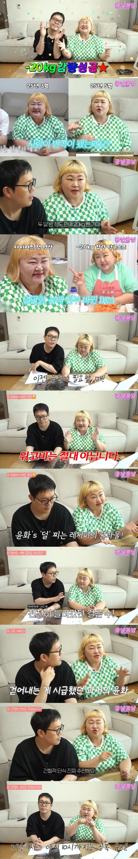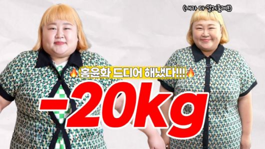 이날 홍윤화는 "20kg이 빠졌다. '20kg 감량 티가 안 난다'고 하셔서 다이어트 첫 번째 영상에 똑같은 옷을 입고 있다. 이렇게 빠졌다"며 한 눈에 봐도 확 달라진 모습으로 눈길을 끌었다.