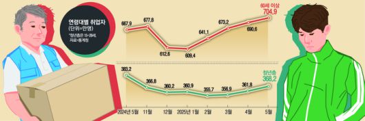 경기 둔화 속에서도 고용지표는 또 한 번 역대 최고치를 찍었다. 취업자는 13개월 만에 20만명 넘게 늘었고, 15~64세 고용률도 통계가 작성된 이래 최고 수준을 경신했다. 하지만 겉으로 드러난 ‘호조’와 달리 60세 이상 취업자가 700만명을 넘어섰고 제조·건설업 등 경기 민감 업종은 여전히 부진해 고용시장 착시 현상이 짙어지고 있다.