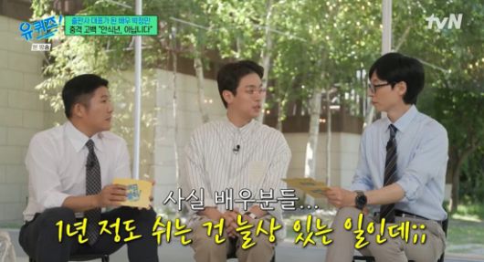 유재석은 "황정민 씨가 같은 회사이지 않냐. 쉰다고 했을 때 황정민 씨는 별 이야기 안 하셨냐"라며 질문했고, 박정민은 "'쉬지 마, 이씨' 했다. 자기도 쉬어야 되는데 너도 쉬면 돈은 누가 버냐고. 순간 그래야 하나 하다가 이번에는 거역했다는 마음으로"라며 귀띔했다.