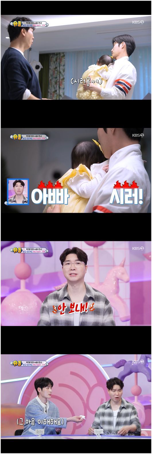 안영미는 “이제 시작이다. 어린이집 보내고, 유치원 보내면”라며 박수홍을 달래려 했다. 박수홍은 “안 보내! 안 보내!”라며 투정을 부렸다. 박수홍은 “준호 삼촌이 좋은가 봐”라며 다시 재이를 안으려고 했으나 재이는 김준호의 품에 쏙 안겨버렸다.