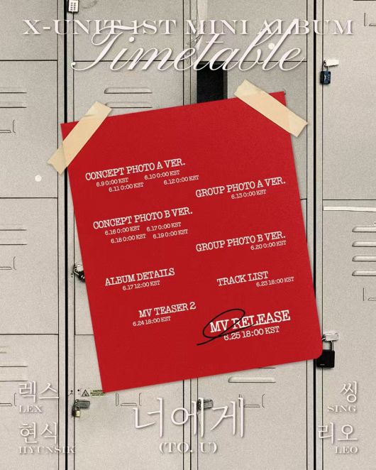 소속사 잭소(JACSO)는 공식 SNS를 통해 X-UNIT 첫 번째 미니 앨범 '너에게 (TO. U)'의 타임 테이블을 발표해 시선을 집중시켰다. X-UNIT은 렉스(LEX), 현식(HYUNSIK), 씽(SING), 리오(LEO)로 구성된 4인 유닛으로, 오는 6월 25일 오후 6시 새 앨범과 구글 Google Cloud Veo 기술이 적용된 뮤직비디오를 함께 발매할 예정이다.