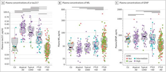 연구 대상군에는 알츠하이머병 환자와 더불어 전두측두엽 치매 환자와 대조를 위한 정상인 등 다양한 퇴행성 뇌 질환 임상 증후군 환자들이 속했다. 연구팀은 혈액 데이터에서 p-tau217 과 신경 손상 정도를 보여주는 NfL(Neurofilament Light Chain), 신경계 염증 상태를 나타내는 GFAP(Glial Fibrillary Acidic Protein)라는 세 가지 바이오마커를 발췌하여 농도를 정밀 분석 장비(SIMOA)로 동시에 살폈다.
