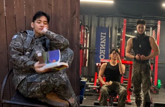 공개한 사진에는 뷔가 군복을 입고 쉬는 시간에 독서 중인 모습, 눈사람을 만든 모습 등이 담겼다. 뷔는 운동으로 완성한 탄탄한 근육질 몸매를 뽐냈다.