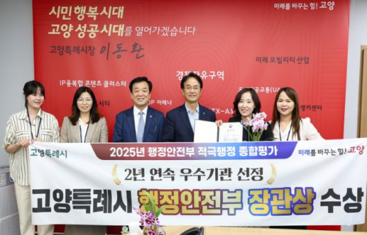 [고양=뉴스핌] 최환금 기자 =고양특례시가 2025년(2024년 실적) 지방자치단체 적극행정 종합평가에서 행정안전부 장관상을 수상했다. 이번 평가는 전국 243개 지자체를 대상으로 실시됐으며, 고양특례시는 지난해에 이어 2년 연속 '적극행정 우수기관'으로 선정되는 쾌거를 이뤘다.