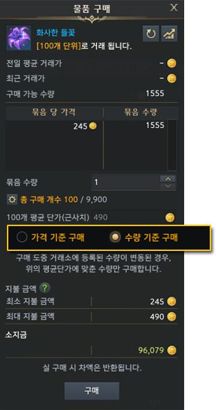 우선 거래소 시스템에서는 구매 UI가 개선됐다. 페온이 소모되는 거래에서만 페온 표시가 노출되도록 변경됐으며, 가격 기준과 수량 기준 중 하나를 선택해 구매할 수 있는 기능이 추가됐다. 특히 재련·생활 재료 구매 시 최대 수량을 직접 입력할 수 있게 됐고, 파괴석 및 수호석 계열 아이템의 거래 단위가 10개에서 100개 묶음으로 조정되면서 기존 등록 물품은 일괄 회수 처리됐다.