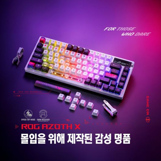 ROG Azoth X는 ROG 게이머를 위한 기존 'ROG Azoth'의 정체성을 이어가면서도, 더욱 정교한 입력 감도와 커스터마이징 요소를 강화한 하이엔드 모델이다. 정방향 PCB 레이아웃을 적용하고, 세 면이 반투명한 섀시 디자인에 화려한 블랙, 화이트, 퍼플 컬러 조합의 특수 염료 키캡을 채택해 RGB 조명이 통과하도록 해 개성 넘치는 비주얼을 보여준다.