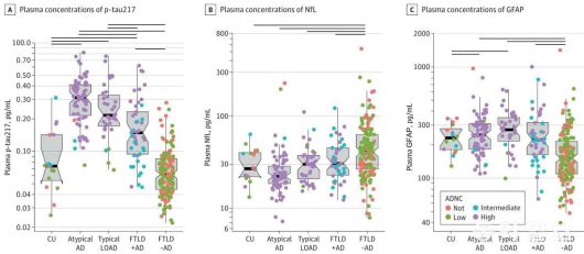 세 가지 바이오마커(p-tau217, NfL, GFAP)를 치매 종류에 적용했을 때 비교 분석 그래프. |