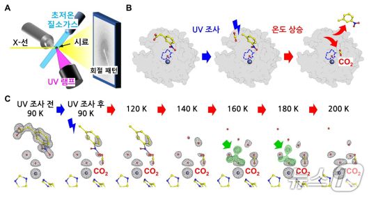 연구팀은 영하 183도에서 효소를 결정화한 뒤 광분해성 기질(3NPA)을 넣었다.