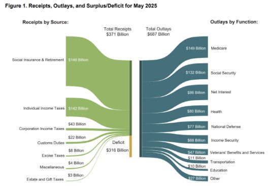 미국 재무부가 11일(현지시간) 발표한 5월 수입 및 지출 내역으로 3160억달러의 재정 적자를 기록하고 있음을 알 수 있다./미 재무부 자료 캡처 |