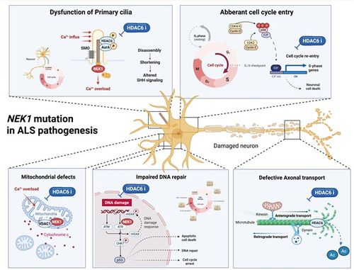 NEK1이 위험 유전자 중 하나라는 사실이 알려졌지만, 어떤 생물학적 세포 이상을 유발하는지 그 구체적인 병태 기전은 밝혀지지 않았다.
