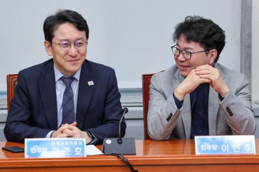 이한주 민주연구원장(오른쪽)이 5일 서울 여의도 국회에서 열린 더불어민주당 최고위원회의에 참석해 천준호 전략기획위원장과 대화하고 있다. 이 원장은 국정기획위원회 위원장에 임명돼 이재명 정부의 국정과제 수립을 총괄할 예정이다. 뉴스1 |