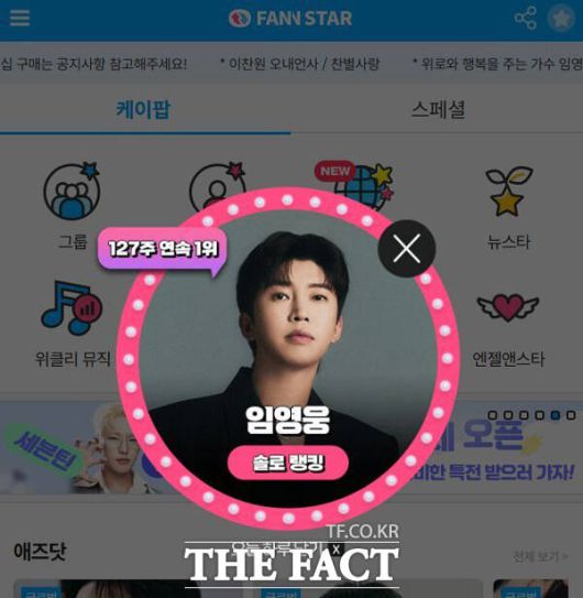 오는 16일 가수 임영웅의 생일을 앞두고 팬클럽이 각종 기부를 통해 선한 영향력을 이어가는 가운데 더팩트 주간 아이돌 랭킹사이트 '팬앤스타' 솔로 랭킹에서 가수 임영웅이 127주 연속 1위를 차지하며 명예의 전당에 입성했다. /더팩트 팬앤스타 |