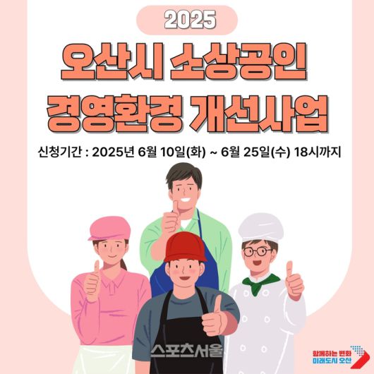 〔스포츠서울│오산=좌승훈기자〕경기 오산시는 소상공인의 안정적인 경영 기반 조성과 사업 경쟁력 강화를 위해 ‘소상공인 경영환경개선사업’ 참여 대상자를 오는 25일까지 모집한다고 12일 밝혔다.