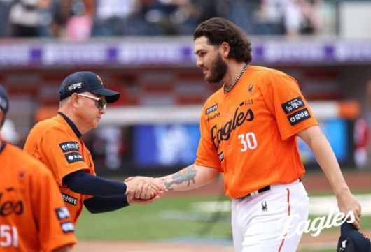 한화 이글스 코디 폰세가 지난달 17일 대전 한화생명볼파크에서 열린 2025 KBO리그 정규시즌 SSG 랜더스와의 홈 경기에서 18탈삼진을 기록한 뒤 김경문 감독과 악수하고 있다. 한화 이글스 제공 |