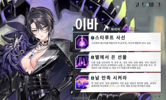 현재 코드 아크에 등장하는 제2의 사도 ‘이바’는, 적 전체를 공격하는 동시에 모든 버프 상태를 해제하는 스킬 2를 가지고 있을 뿐만 아니라, 적 전체를 공격하는 동시에 최대 생명력이 가장 높은 1명에게 관통 효과를 부여하고, 자신에게는 무적 효과를 부여하는 스킬 3을 가진 매우 강력한 단원이다.