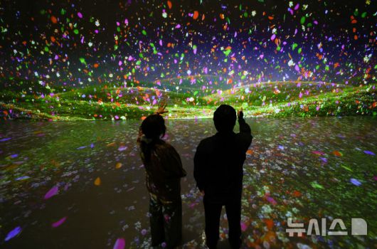 [서울=뉴시스] 황준선 기자 = 12일 서울 용산구 문화역서울 284에서 열린 '우리들의 낙원' 사전 공개 행사에서 관람객들이 스튜디오 레논의 '금강내산:허와 실의 조화' 작품을 관람하고 있다. 오는 13일 개막하는 '우리들의 낙원' 전시는 행복과 이상향을 주제로 하여 과거 사람들이 서울역에서 품어왔던 출발, 설렘, 시대, 위안 등 장소성을 되새기며 행복과 이상향을 탐구하는 여정을 VR, 사진, 설치, 영상 등 50여가지 작품으로 선보인다. 2025.06.12. hwang@newsis.com |