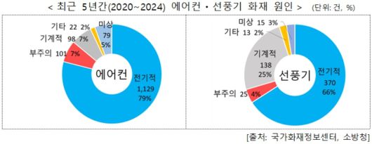 원인별로는 전기접촉 불량 등 전기적 요인(에어컨 79%, 선풍기 66%)이 가장 많았으며, 모터 과열 등 기계적 요인과 사용·설치 시 부주의가 그 뒤를 이었다.